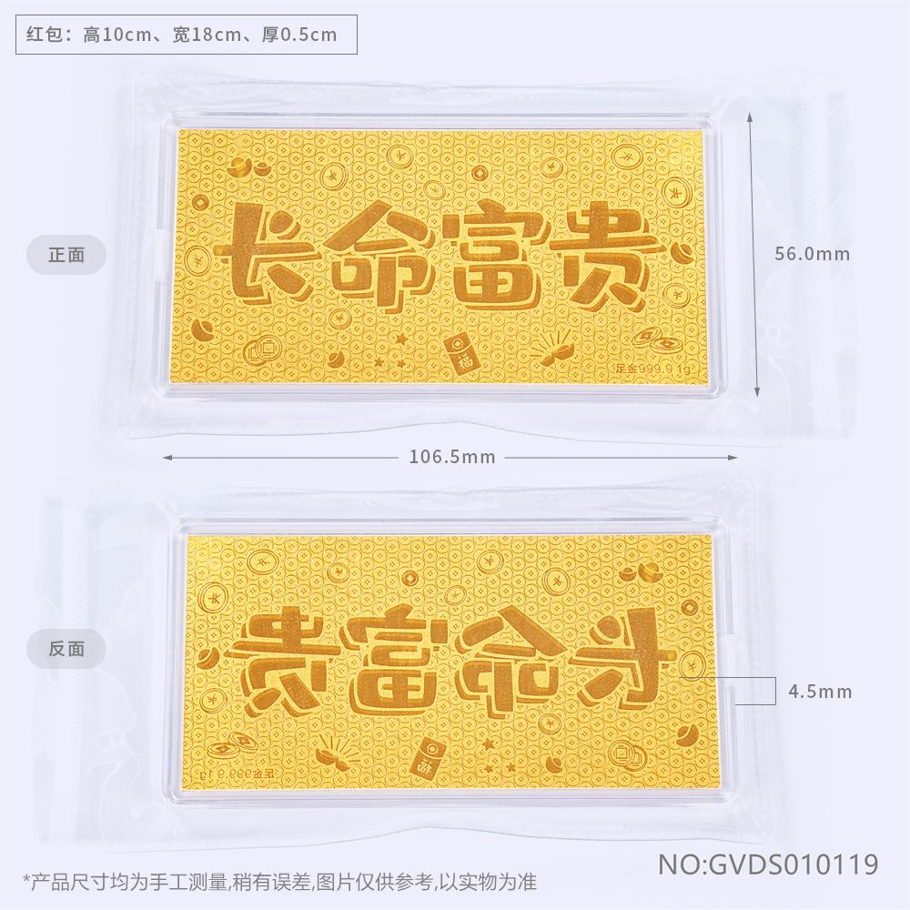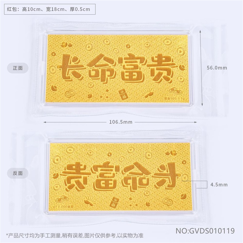 足金999.9平面金钞1G长命富贵黄金金钞(含红包和亚克力盒)